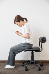 椅子に座るときは深く腰をかけ、背もたれに軽く背中をつけるようにしましょう。スマホを見るときも、下を向きすぎないように注意します。