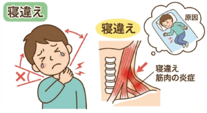 寝違えは、睡眠中の不自然な姿勢や冷えなどが原因で、首や肩まわりの筋肉・靭帯に炎症が起きている状態です。